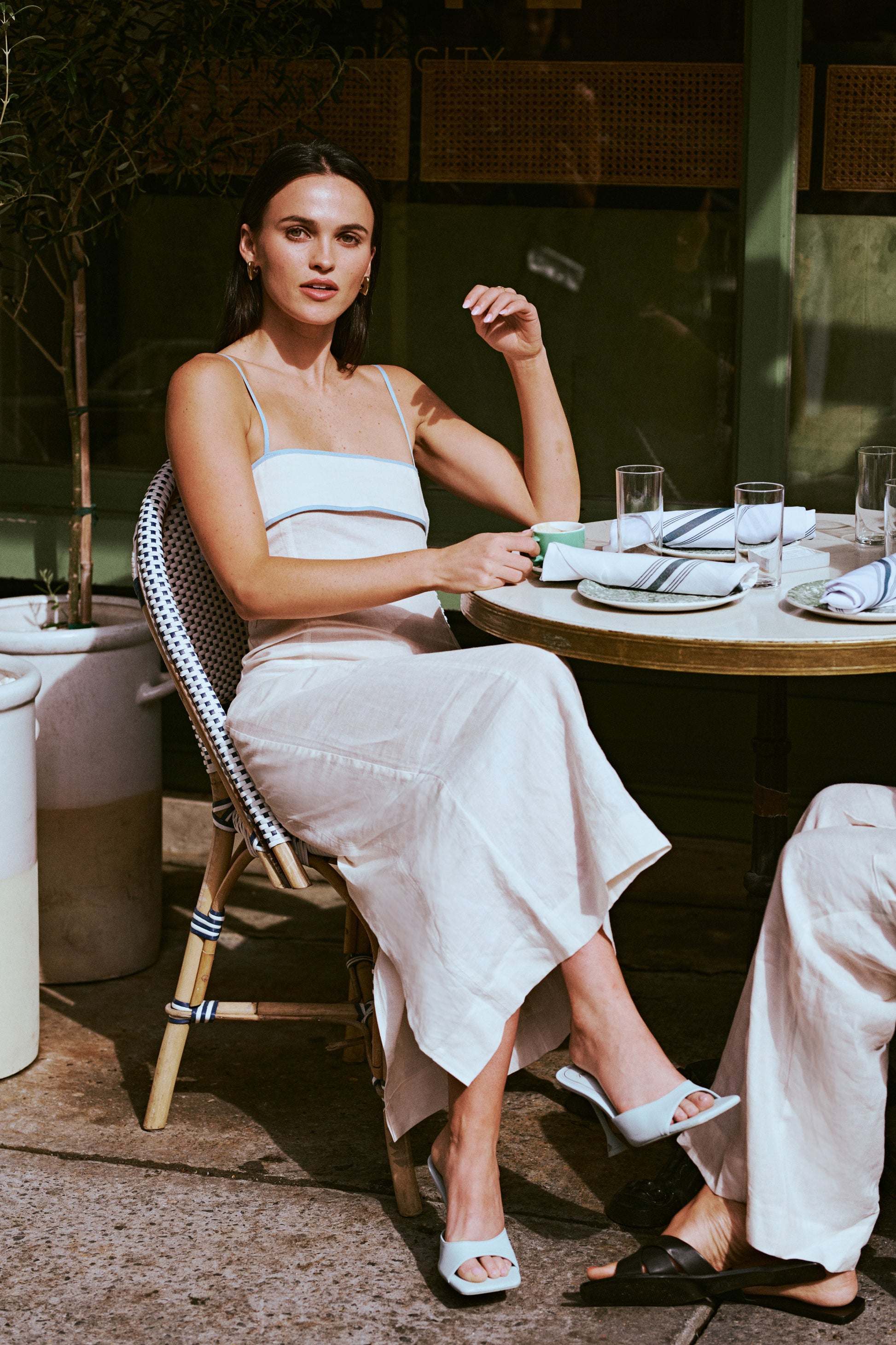 Effortless, timeless and a little bit cheeky. Our ecru linen paired with the subtle pop of sky blue contrast binding is quintessential summer. A perfect accompaniment to seaside adventures be it on the beach or in town. A wardrobe essential.