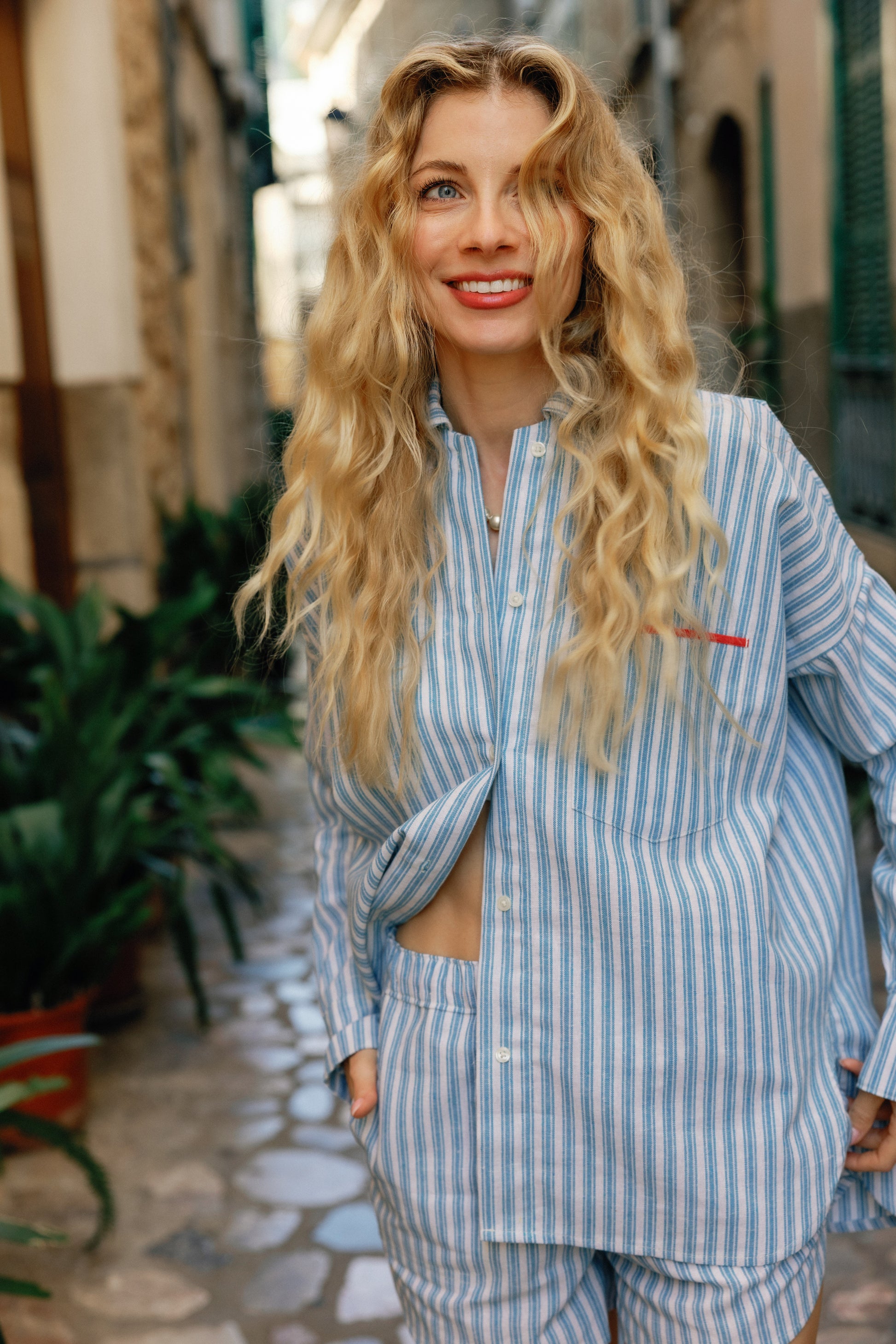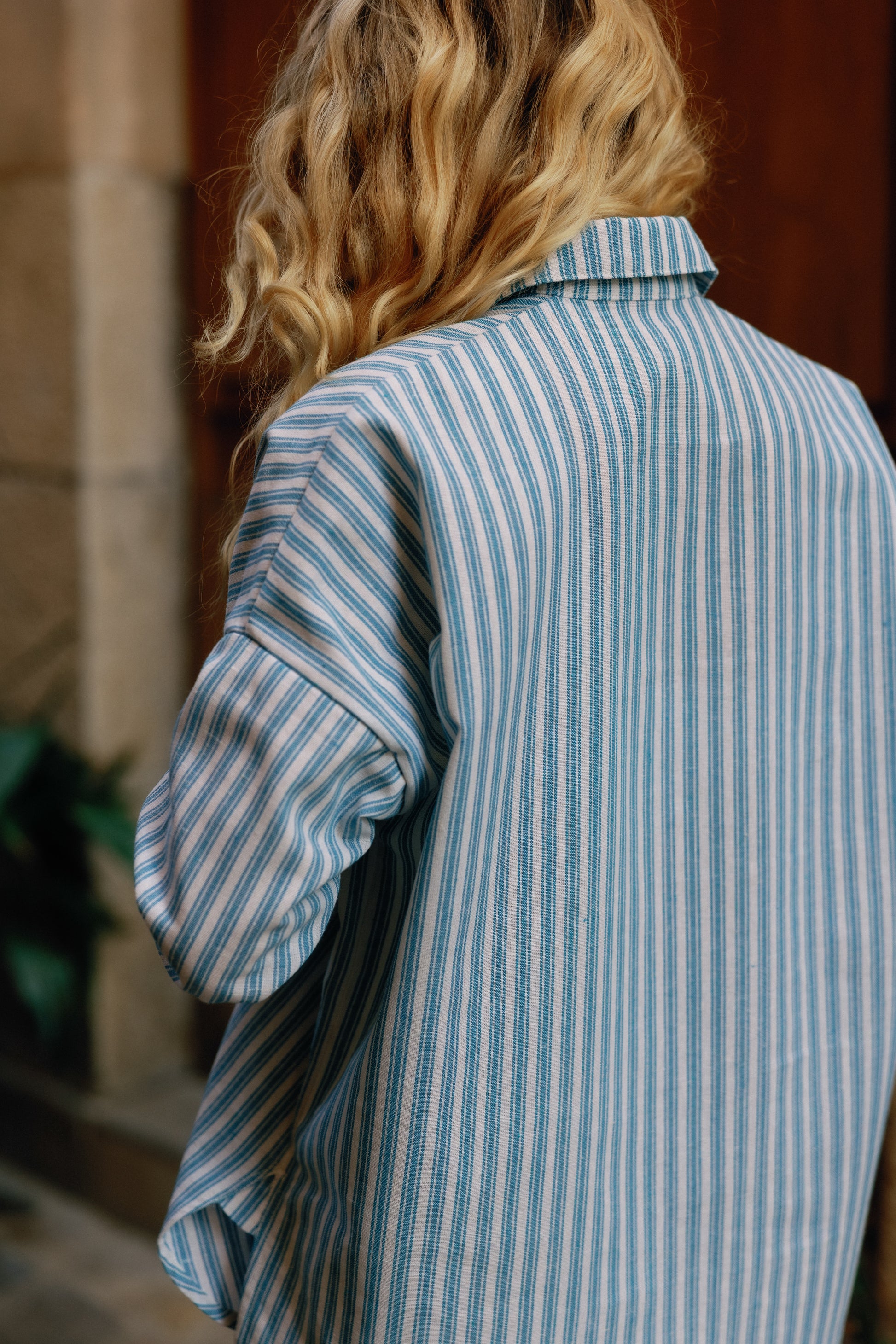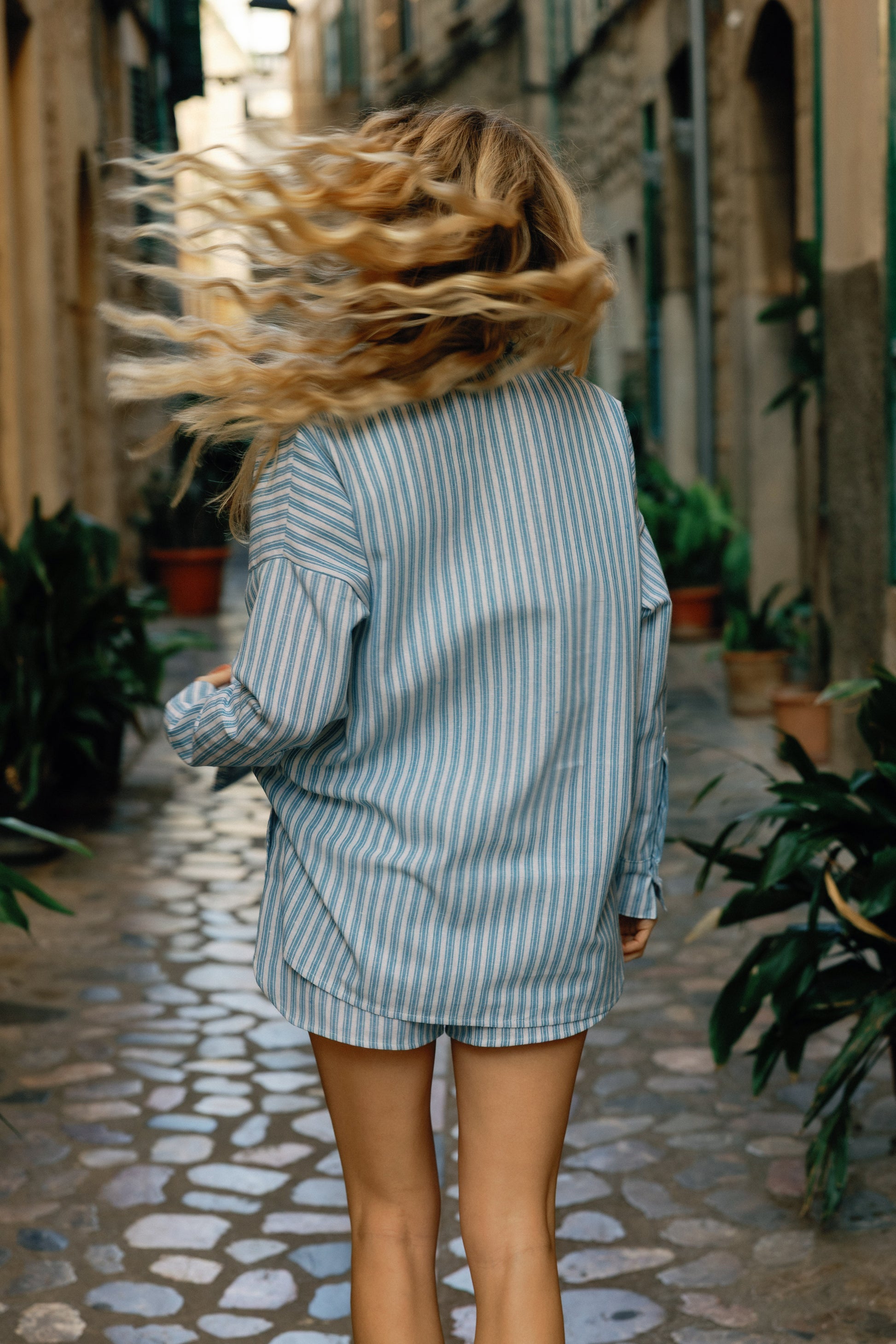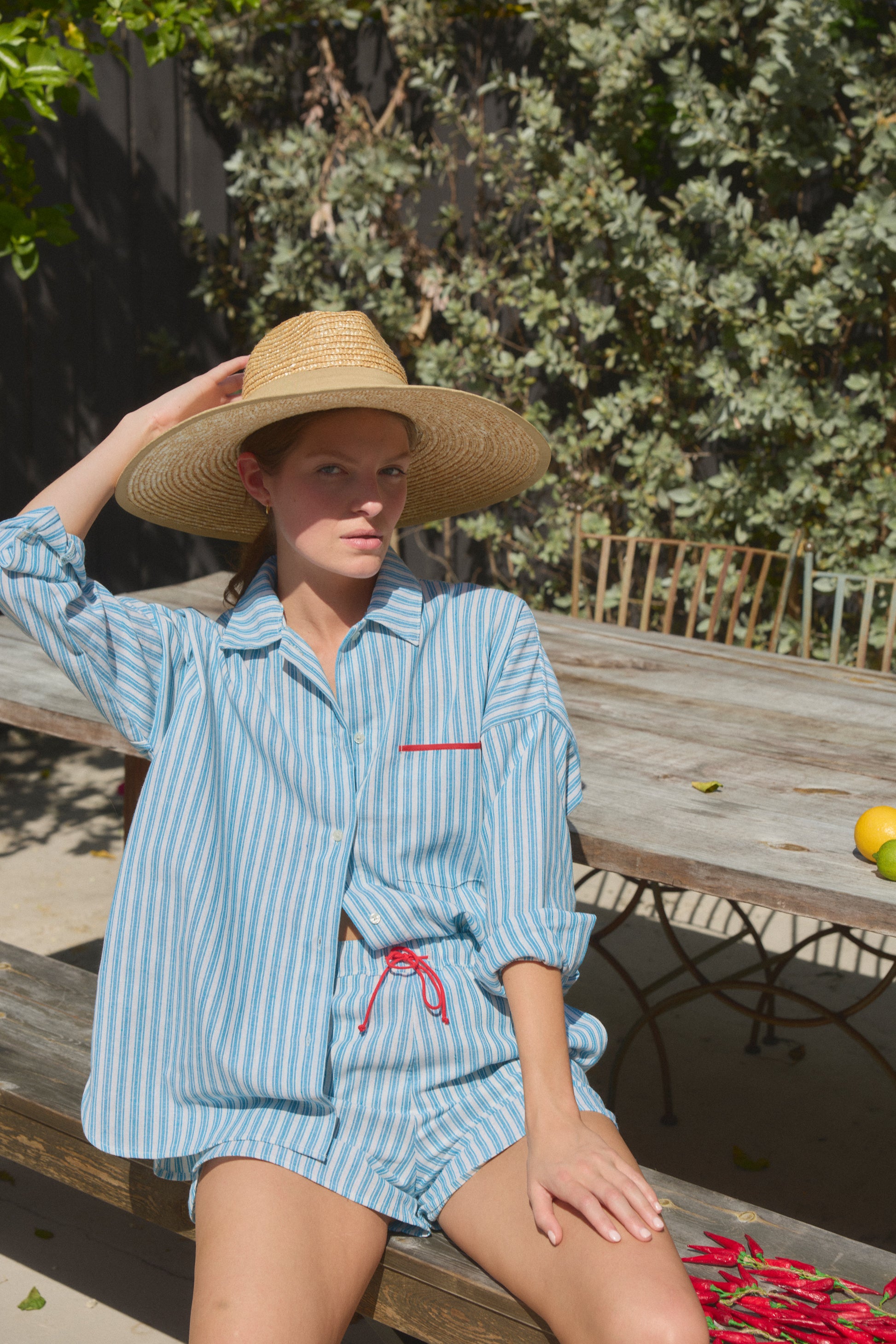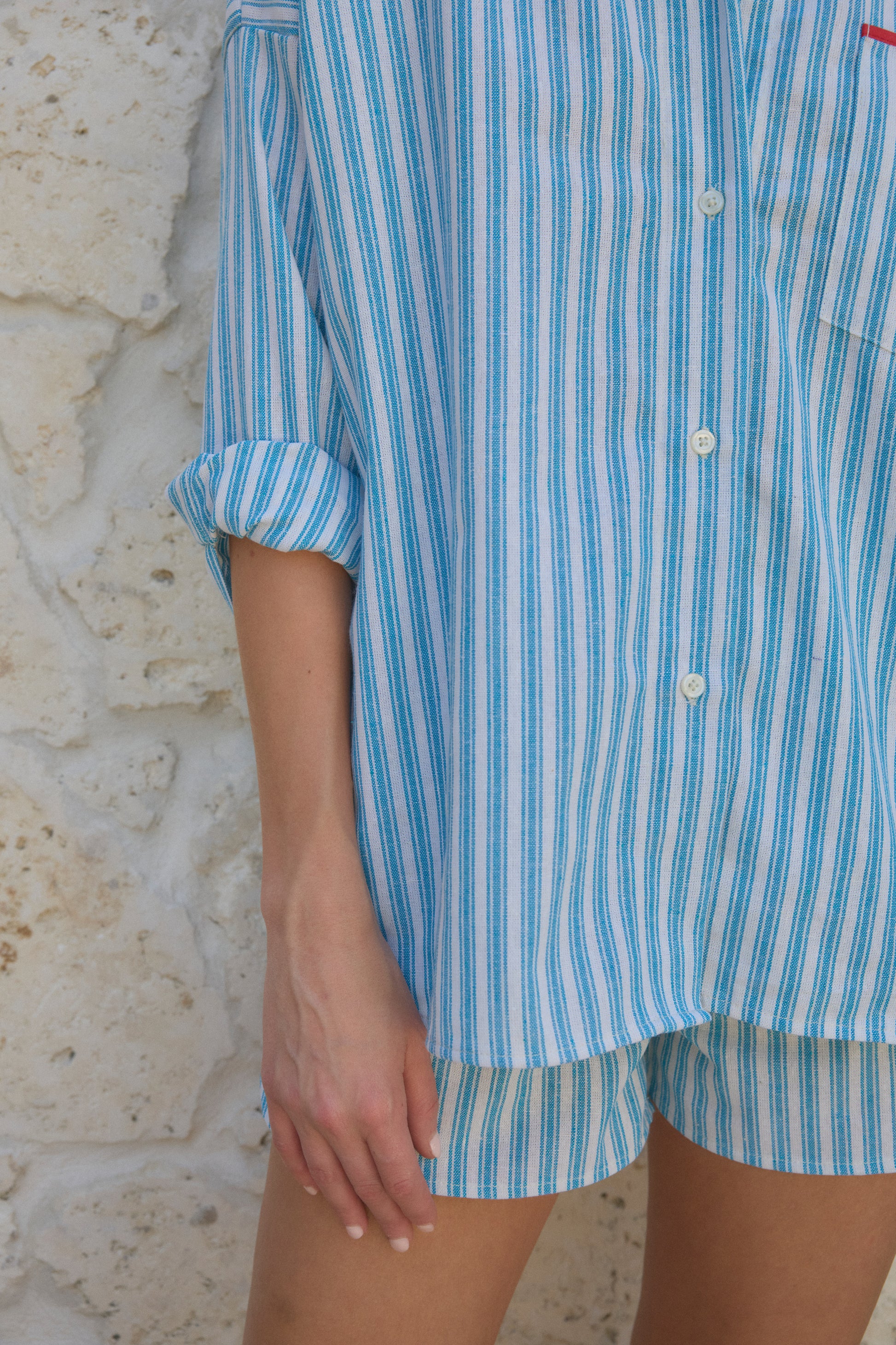 Designed with a drop shoulder, a perfectly oversized silhouette, and made in a soft, low-wrinkle linen, it’s the shirt you throw on without thinking twice and then again on repeat. Made with in a classic blue and white stripe with a cool fade. Featuring our signature pop of red binding at the pocket. Pair it with the Cooper short for the easiest look. Somehow this set can live at the beach, on errand runs, and at a rooftop party with a low red heel, and everywhere in between!