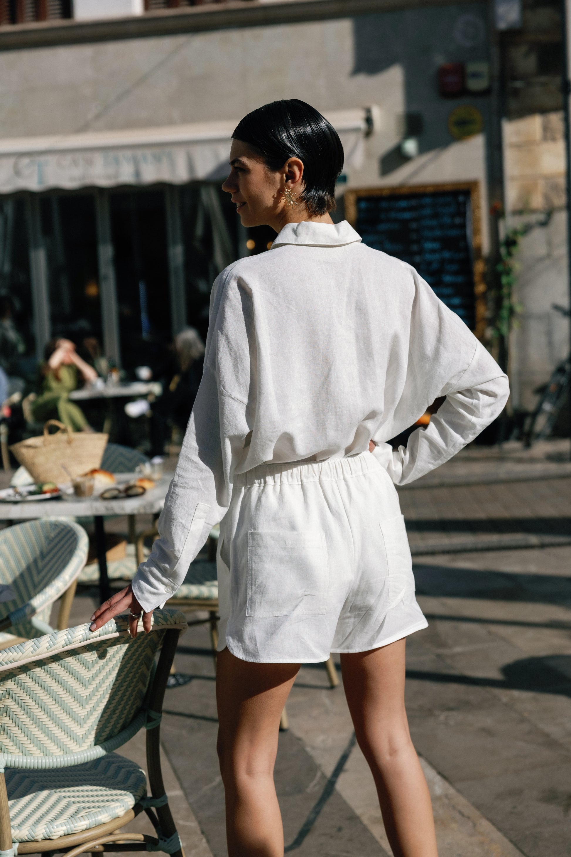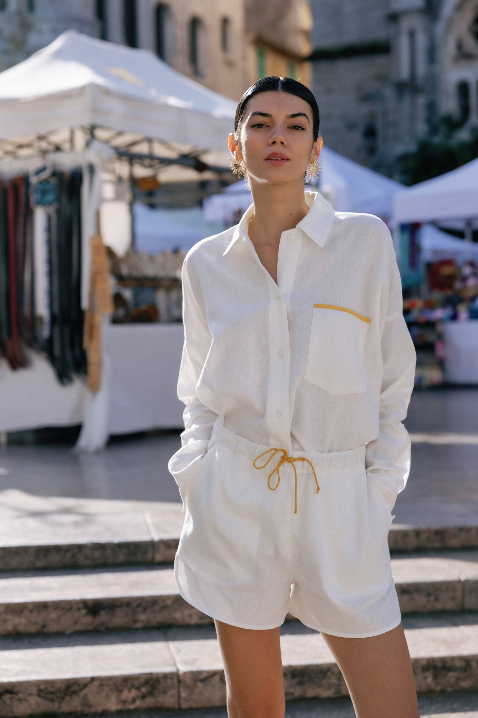 The Dune Short is a heightened version of the boyfriend, boxer, pool short trend. With a little more structure, pockets, and a happy pop of yellow on the drawstring. Pair it back to the Dune Shirt for the full ensemble. It's the perfect coverup while pool side or beach bound. Dress it up with gold accessories and a sun kissed glow.