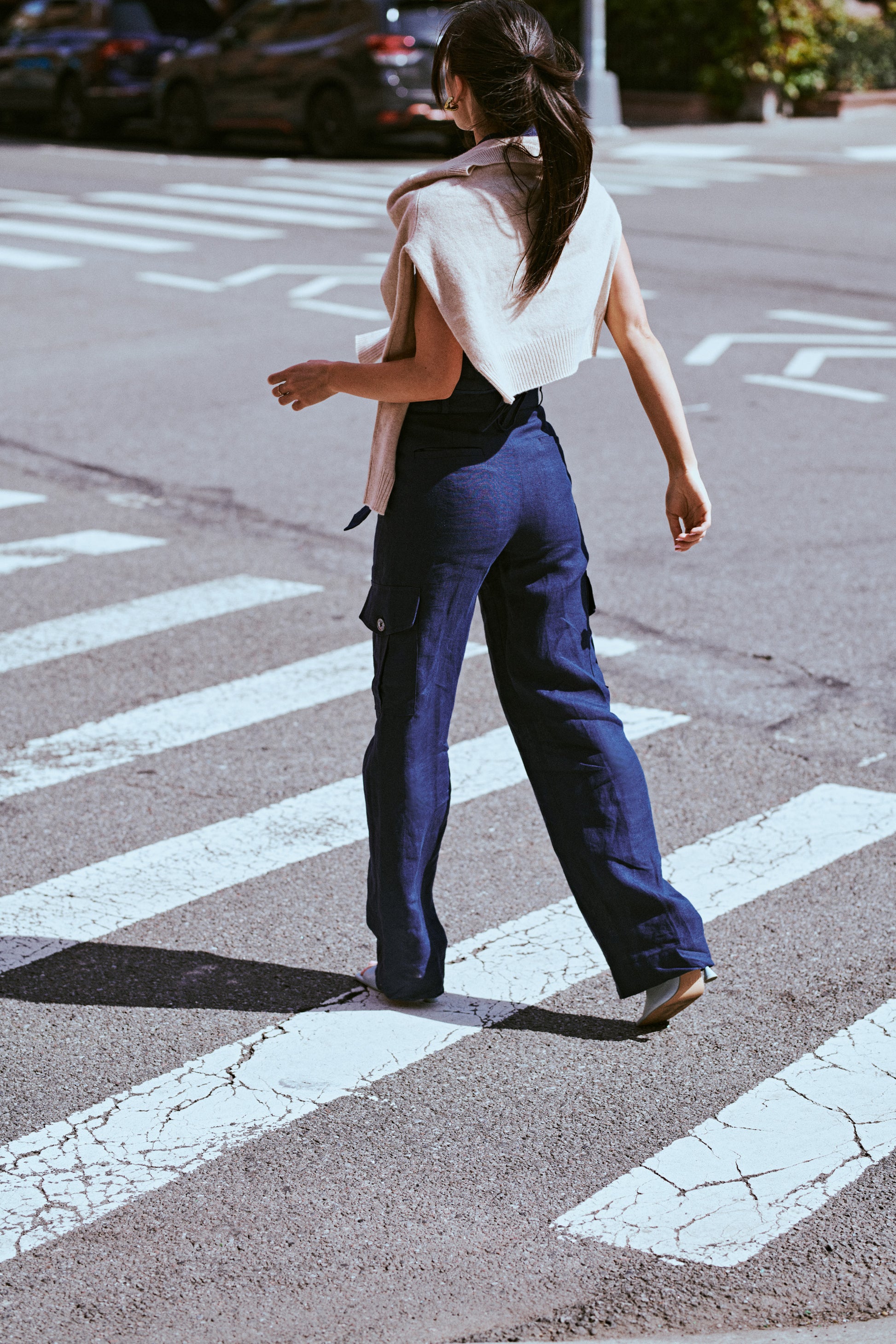 Our structured linen cargo pant with a relaxed fit. Designed and tailored to sit perfectly on your bum while simultaneously having a comfortable rise and flow. We can’t stop wearing these pants. We recommend pairing it back to our button down vest for the full ensemble. Guaranteed outfit envy. For the full effect throw one of our cozy crewnecks over so you can be your most spontaneous version of yourself from chilly mornings to hot afternoons. The outfit only adds to the occasion.